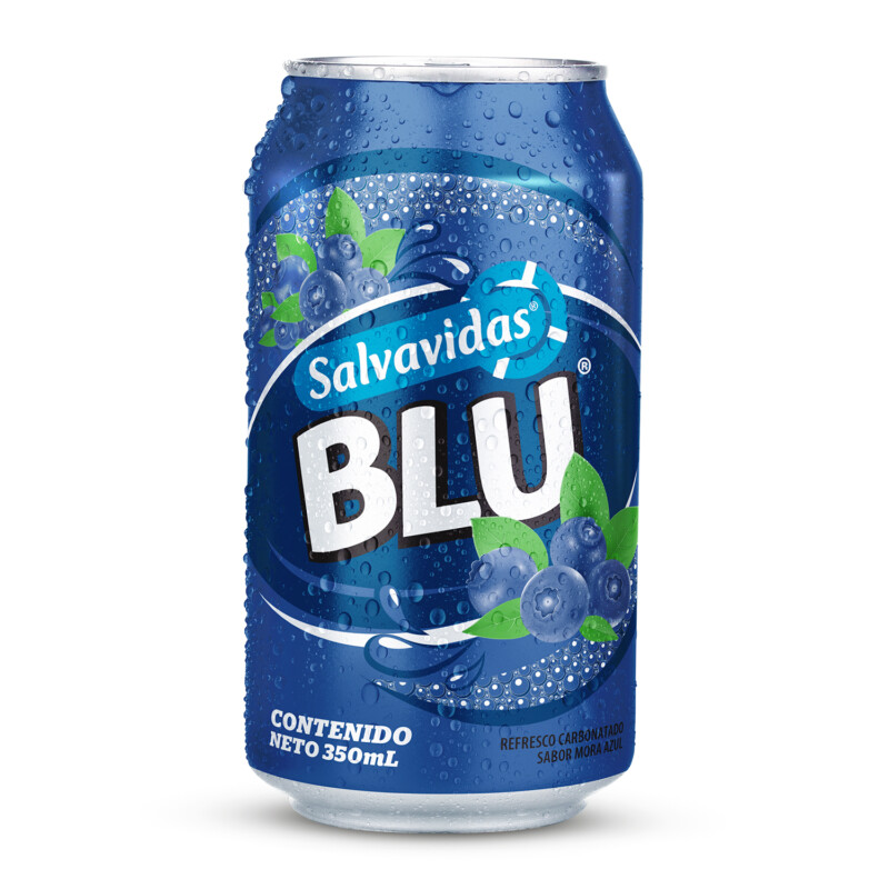 Caja de 24 unidades, Salvavidas Blu lata 12 onzas. Bebida carbonatada sabor mora azul.